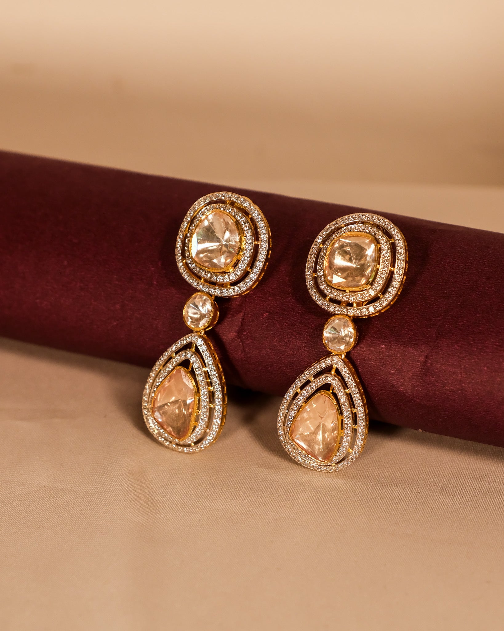 Thoughtfully designed by Kesari Rajat in hallmarked 92.5 silver, the Saanjh Rekha Earrings capture the glow of twilight in a refined arc. Polished to perfection and adorned with a graceful arrangement of clear, pear-cut stones, these earrings offer timeless sophistication—ideal for festive gatherings, bridal celebrations, or heartfelt gifting.