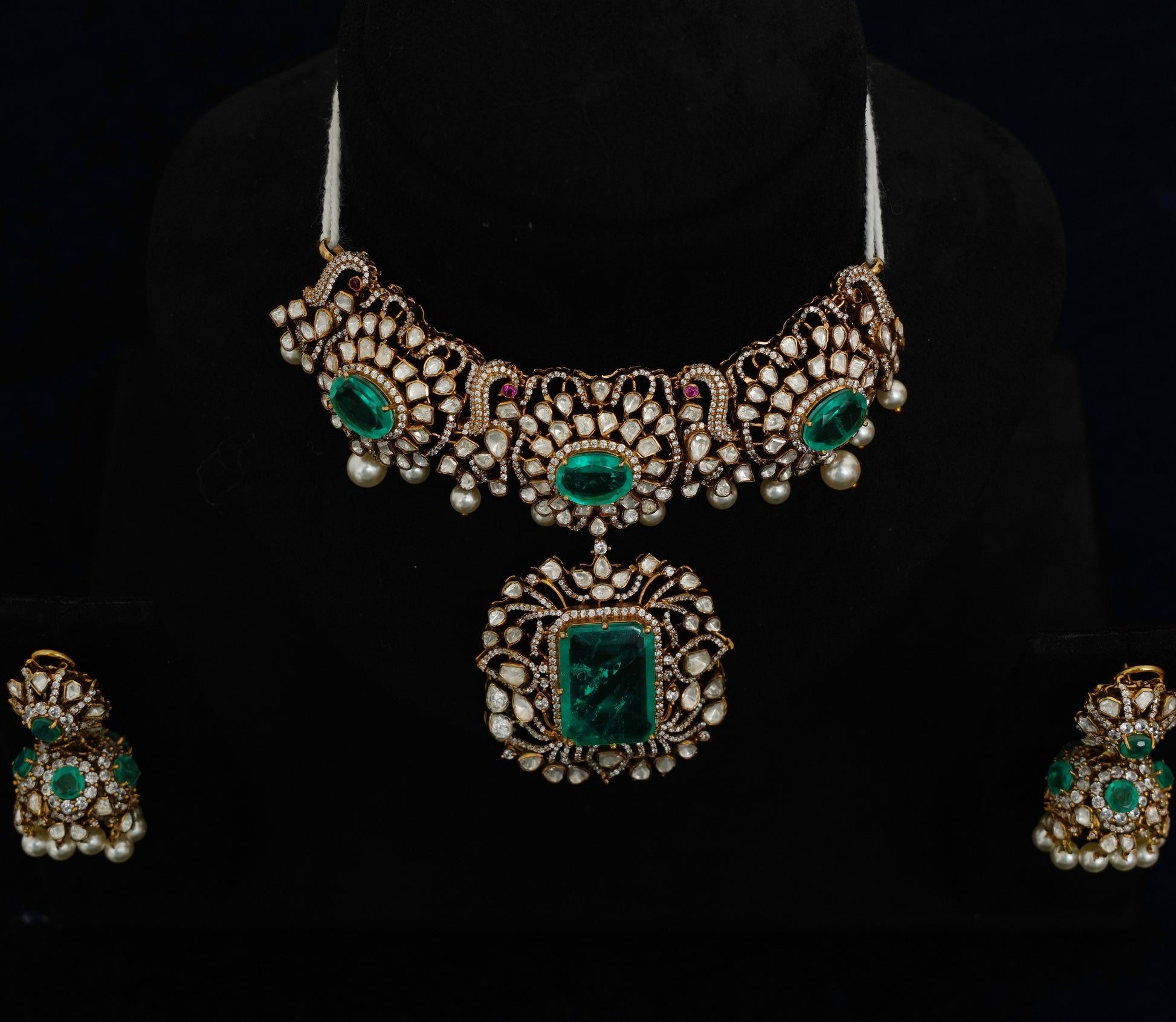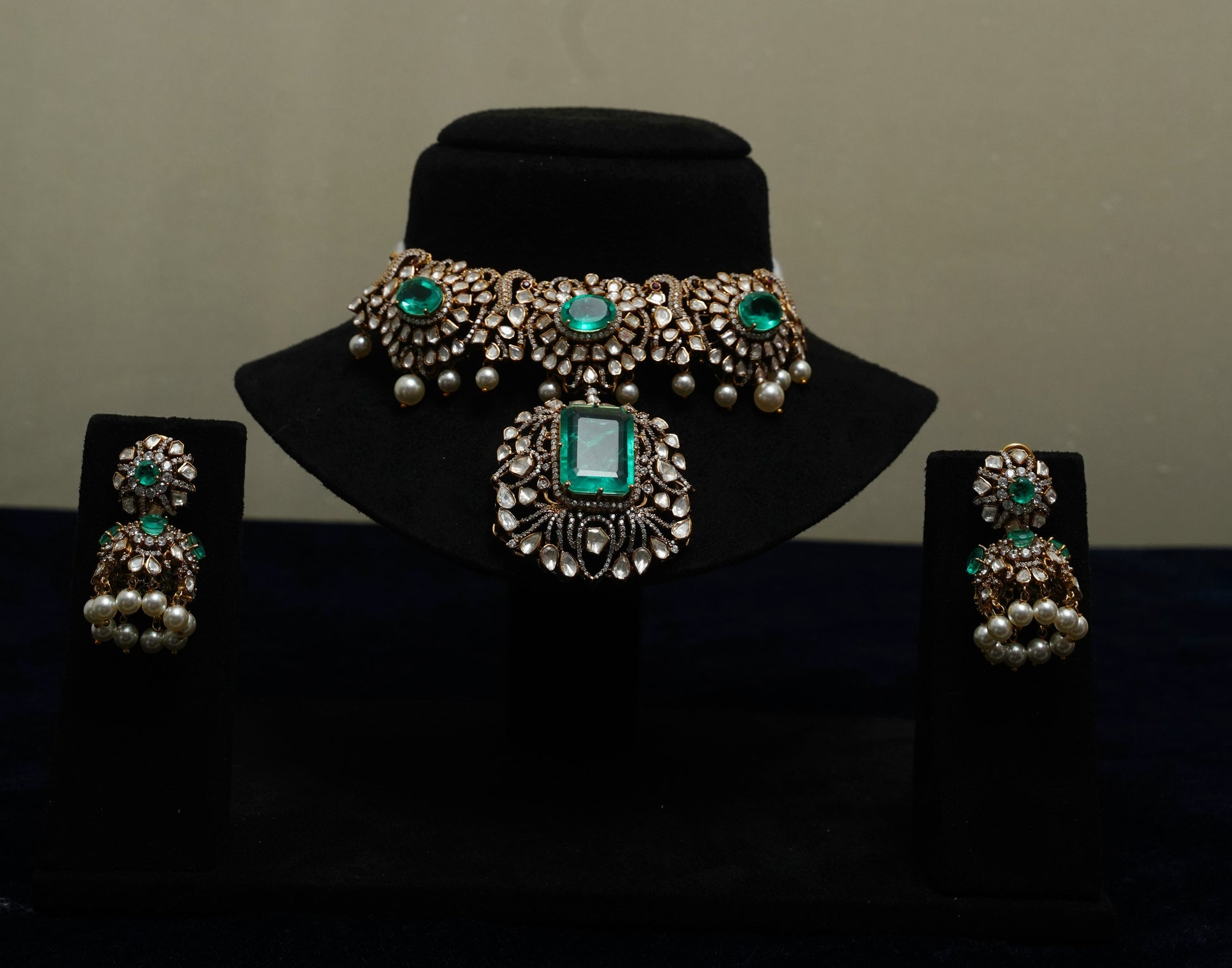 Thoughtfully designed by Kesari Rajat in hallmarked 92.5 silver, this pure 925 silver necklace set exudes timeless grandeur. The choker-style design features intricate detailing with emerald-green stones framed by ornate floral and pearl accents. Perfectly polished and non-adjustable, it is ideal for festive, bridal, party, and gifting occasions — a true heirloom piece.
