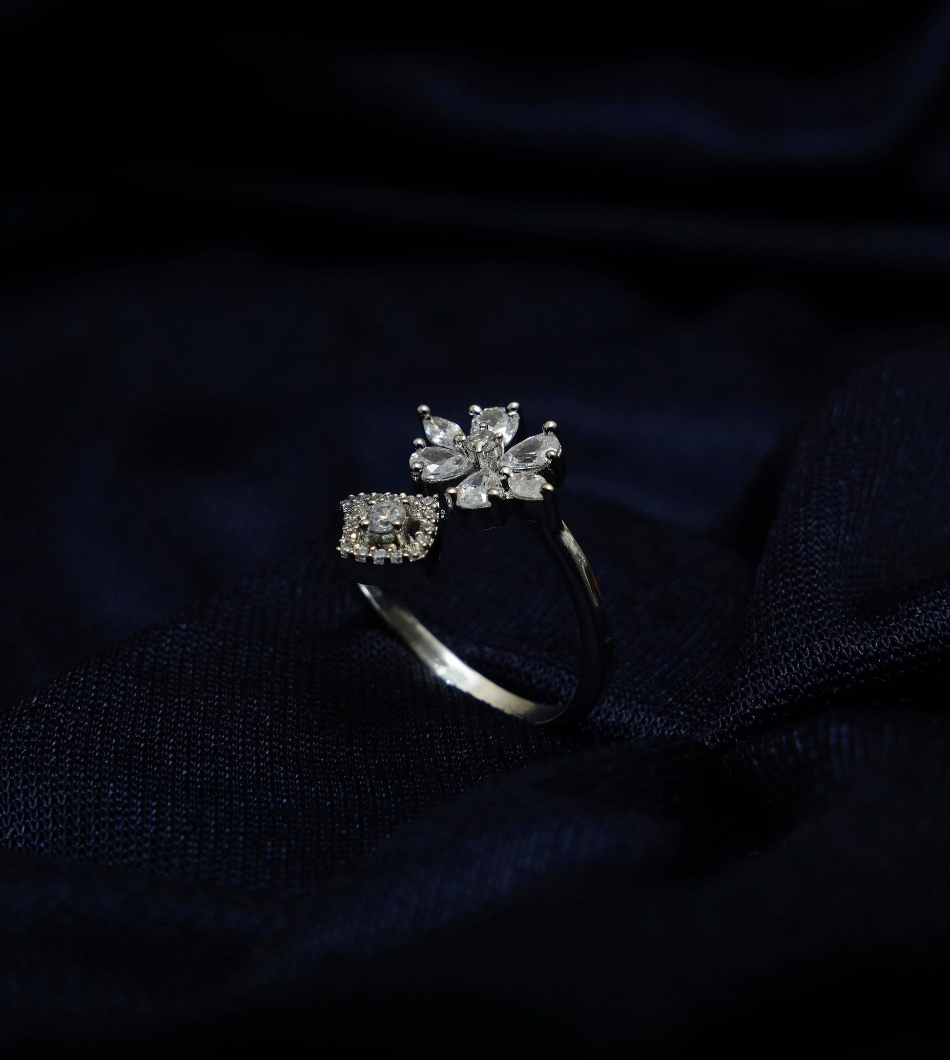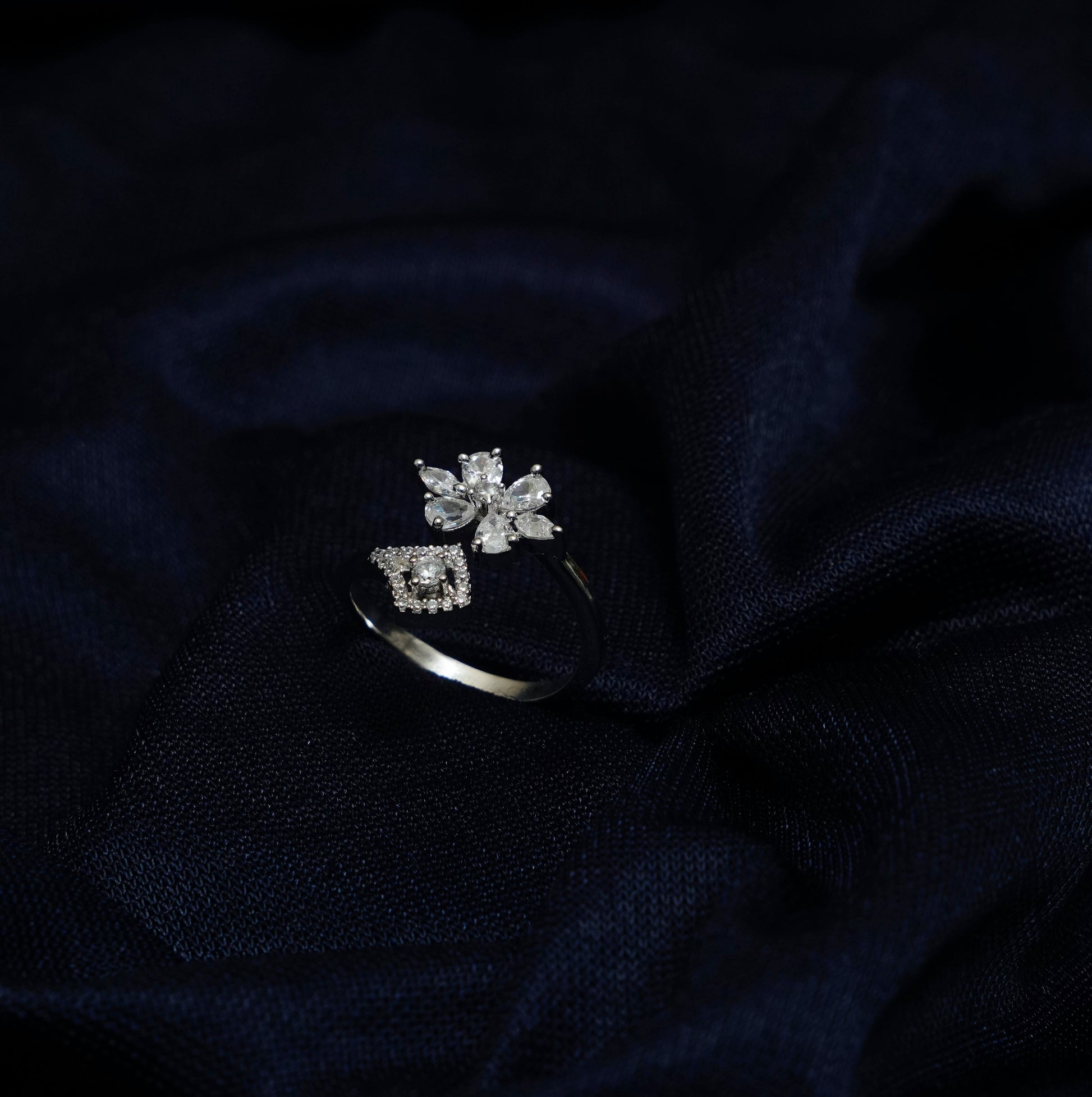 Thoughtfully designed by Kesari Rajat in hallmarked 92.5 silver, this pure 925 silver ring features a polished finish and an enchanting open design adorned with a delicate floral motif paired with a sparkling cluster. Its graceful charm makes it perfect for festive celebrations, parties, bridal elegance, and timeless gifting.