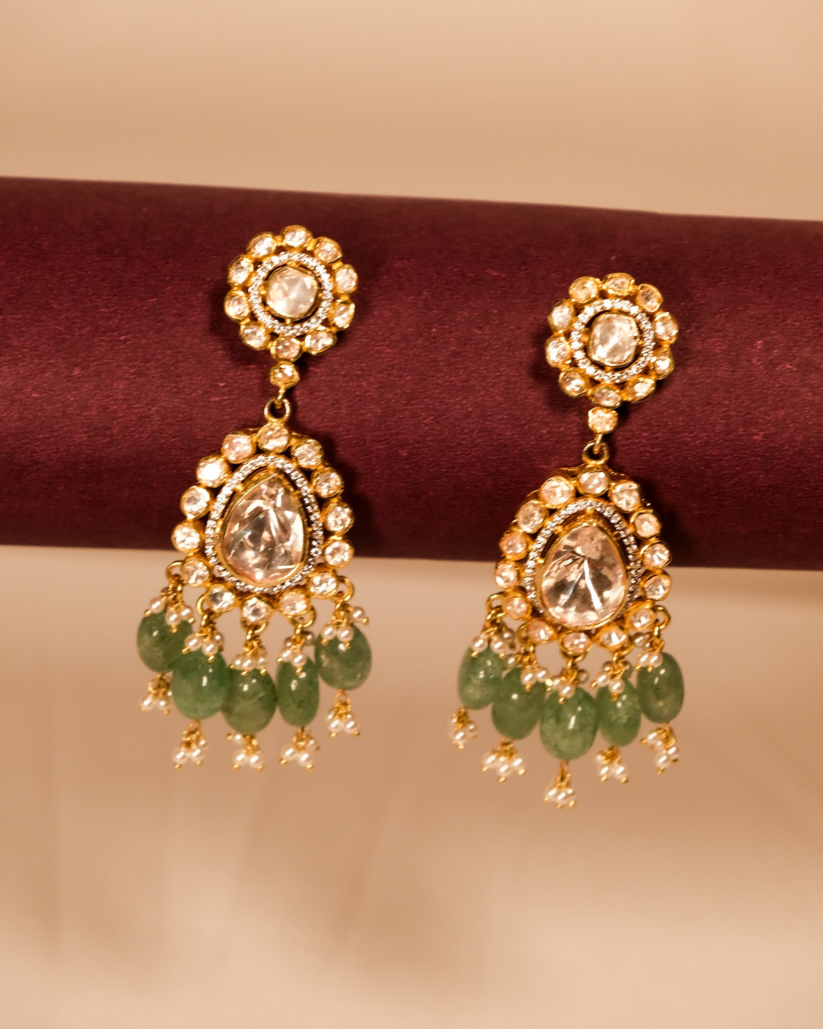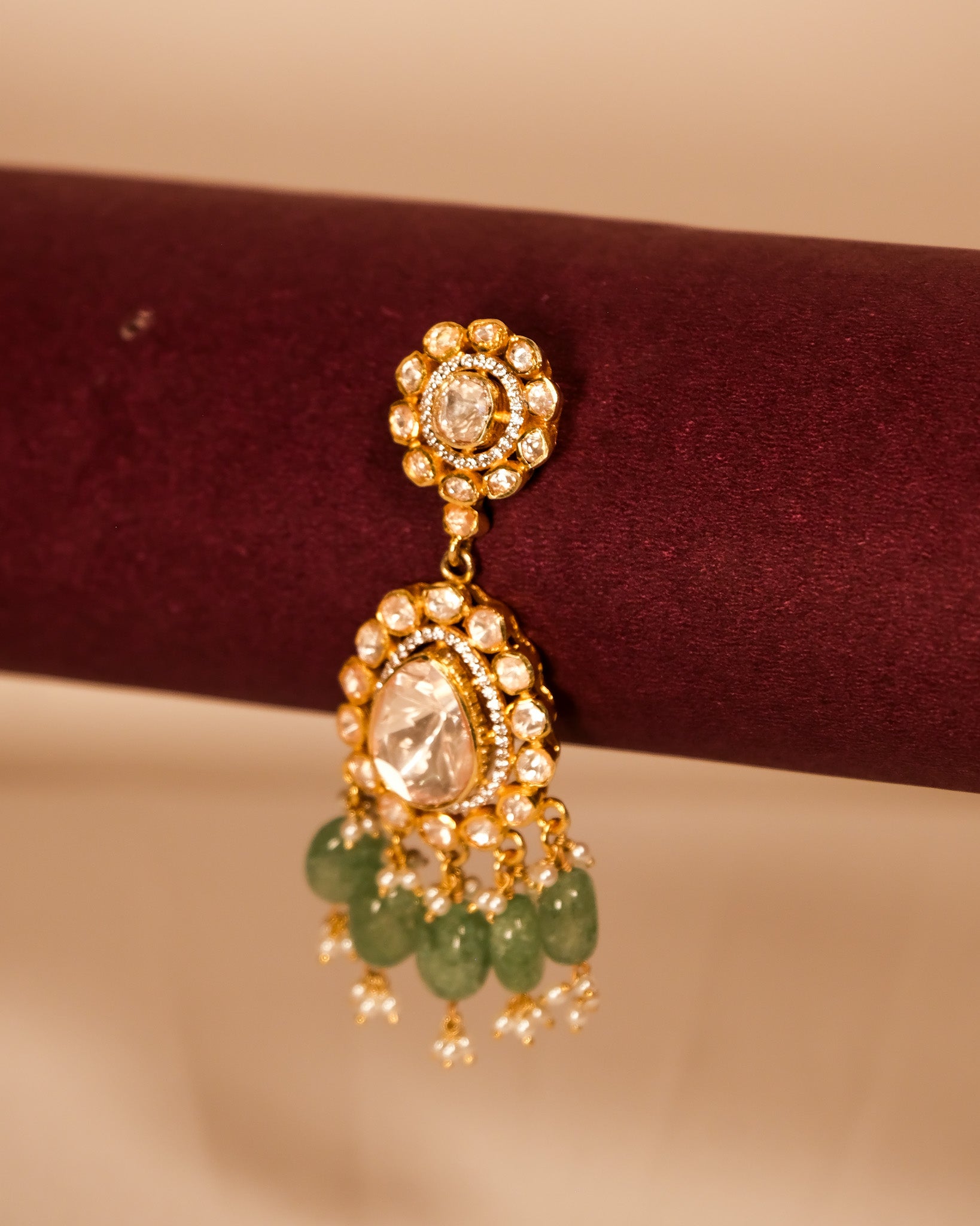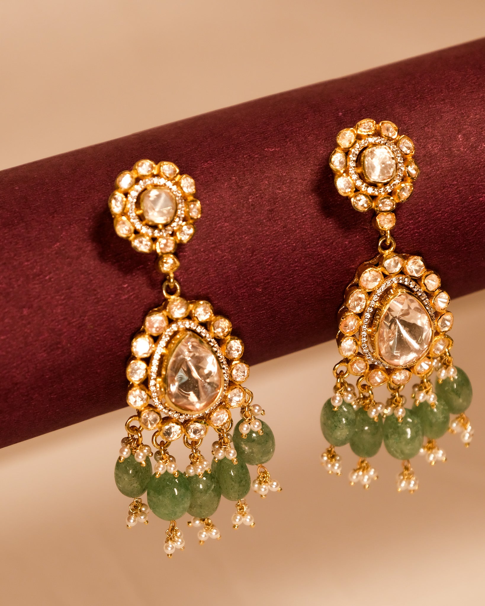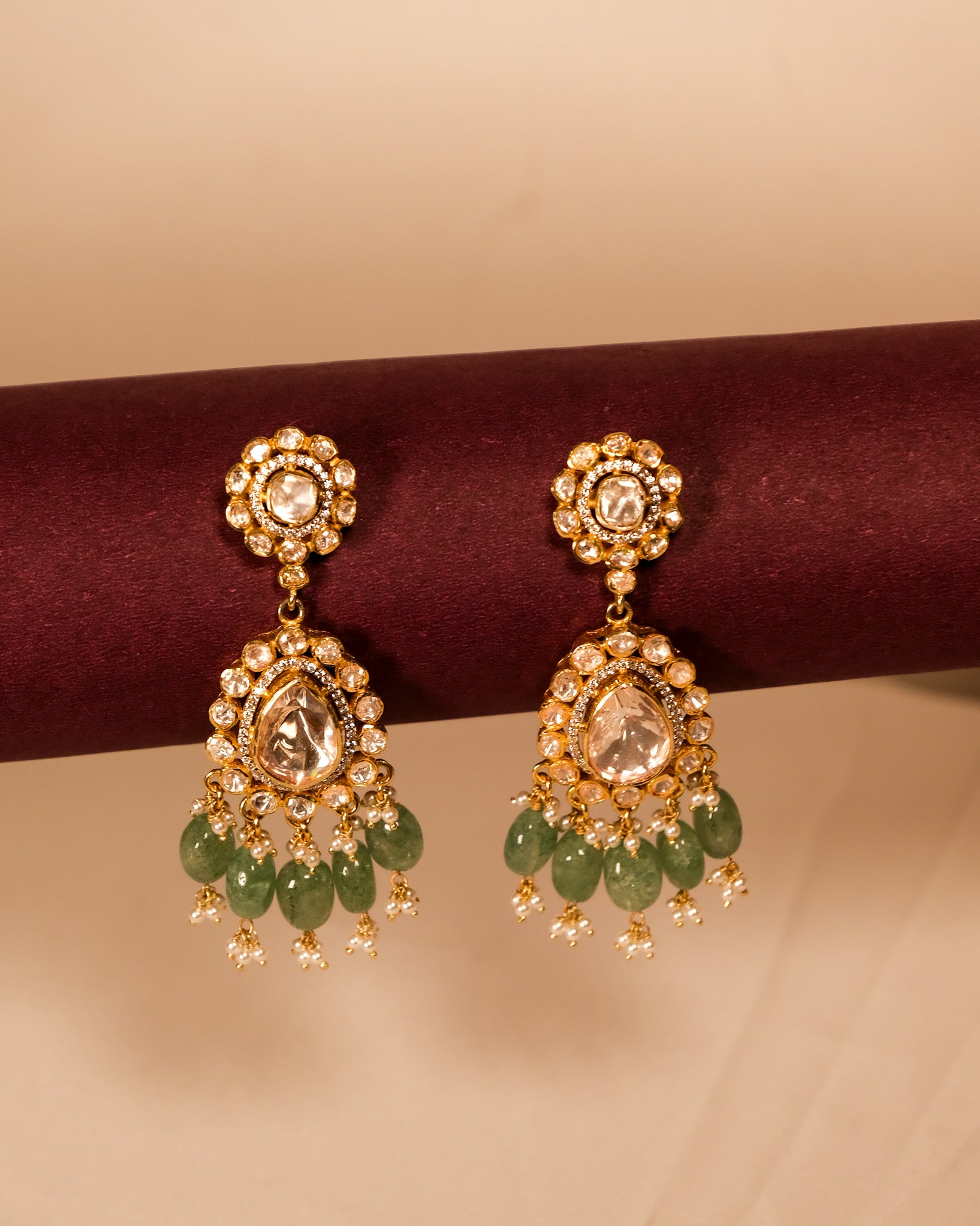 Thoughtfully designed by Kesari Rajat in hallmarked 92.5 silver, the Charita earrings embody timeless elegance and divine celebration. With a radiant kundan floral motif and green gemstone droplets, this piece exudes charm and auspicious energy—perfect for gracing festive gatherings, bridal occasions, or heartfelt gifting moments.