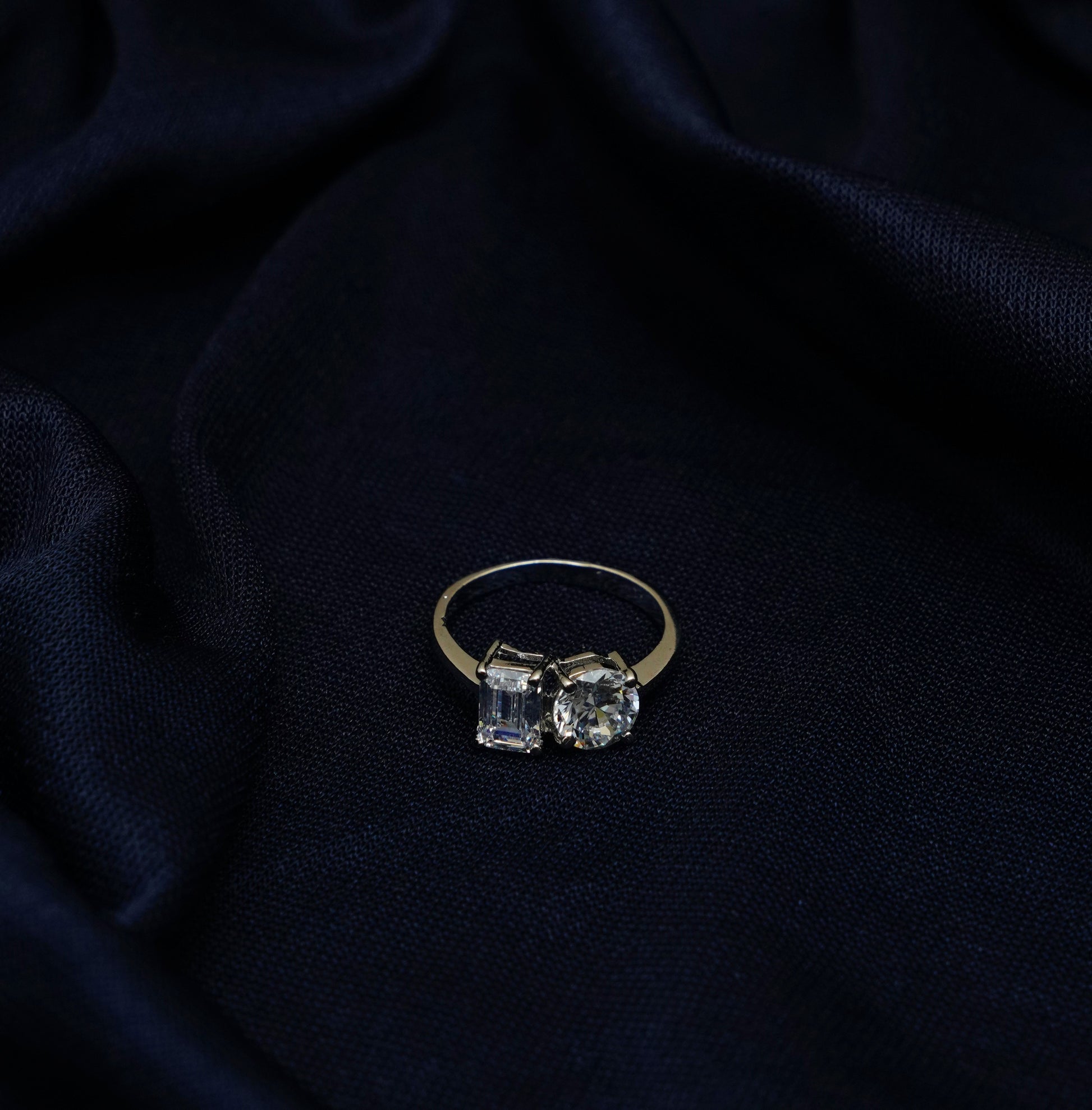 Crafted by Kesari Rajat in hallmarked 92.5 silver, this polished ring features a striking duo of contrasting cuts—one emerald, one round—set side by side in perfect harmony. A symbol of balance and elegance, it is ideal for bridal occasions, festive wear, and gifting with grandeur.