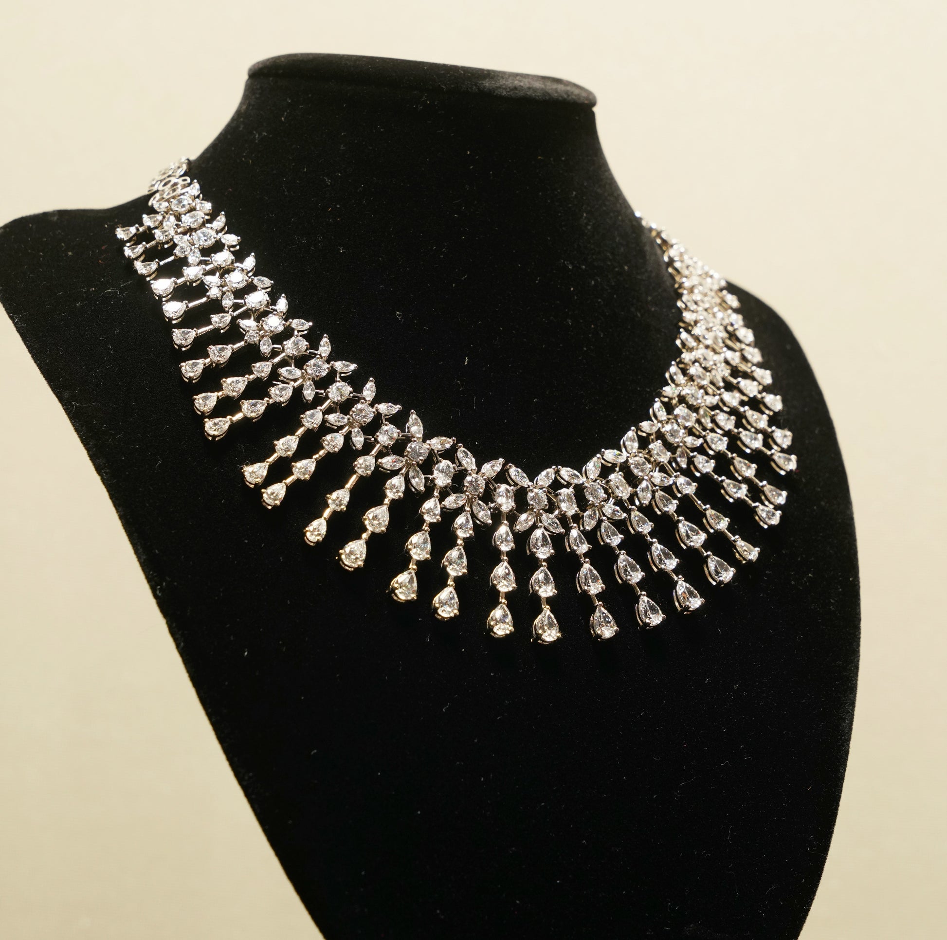 Crafted by Kesari Rajat in hallmarked 92.5 silver, this polished necklace and earring set features a dramatic layered drape of sparkling stones that flow in elegant symmetry. The cascading design exudes grandeur, making it a stunning choice for bridal elegance, festive occasions, or thoughtful gifting. Whether paired with a traditional saree or a contemporary gown, it adds a luminous statement to every ensemble.