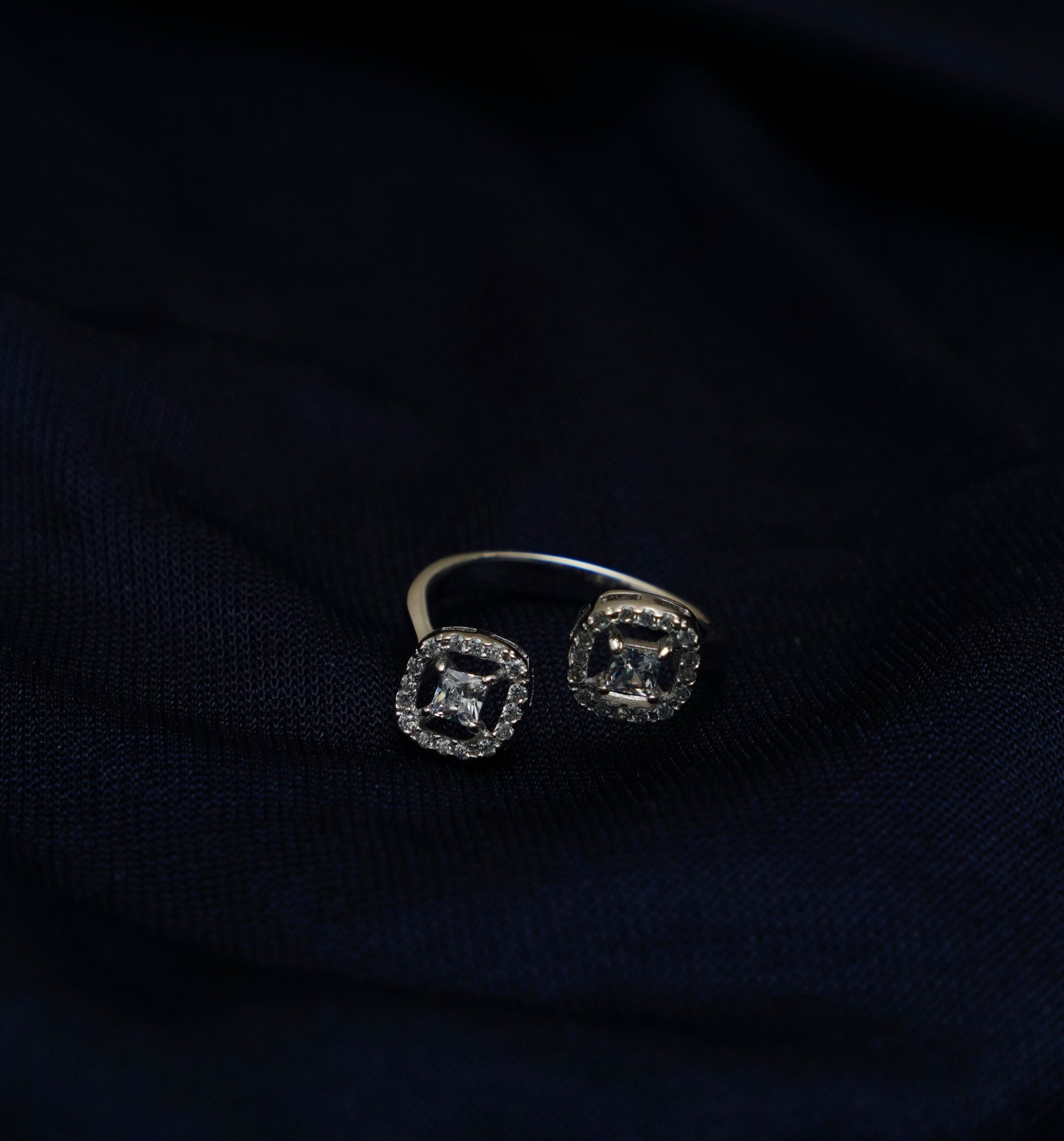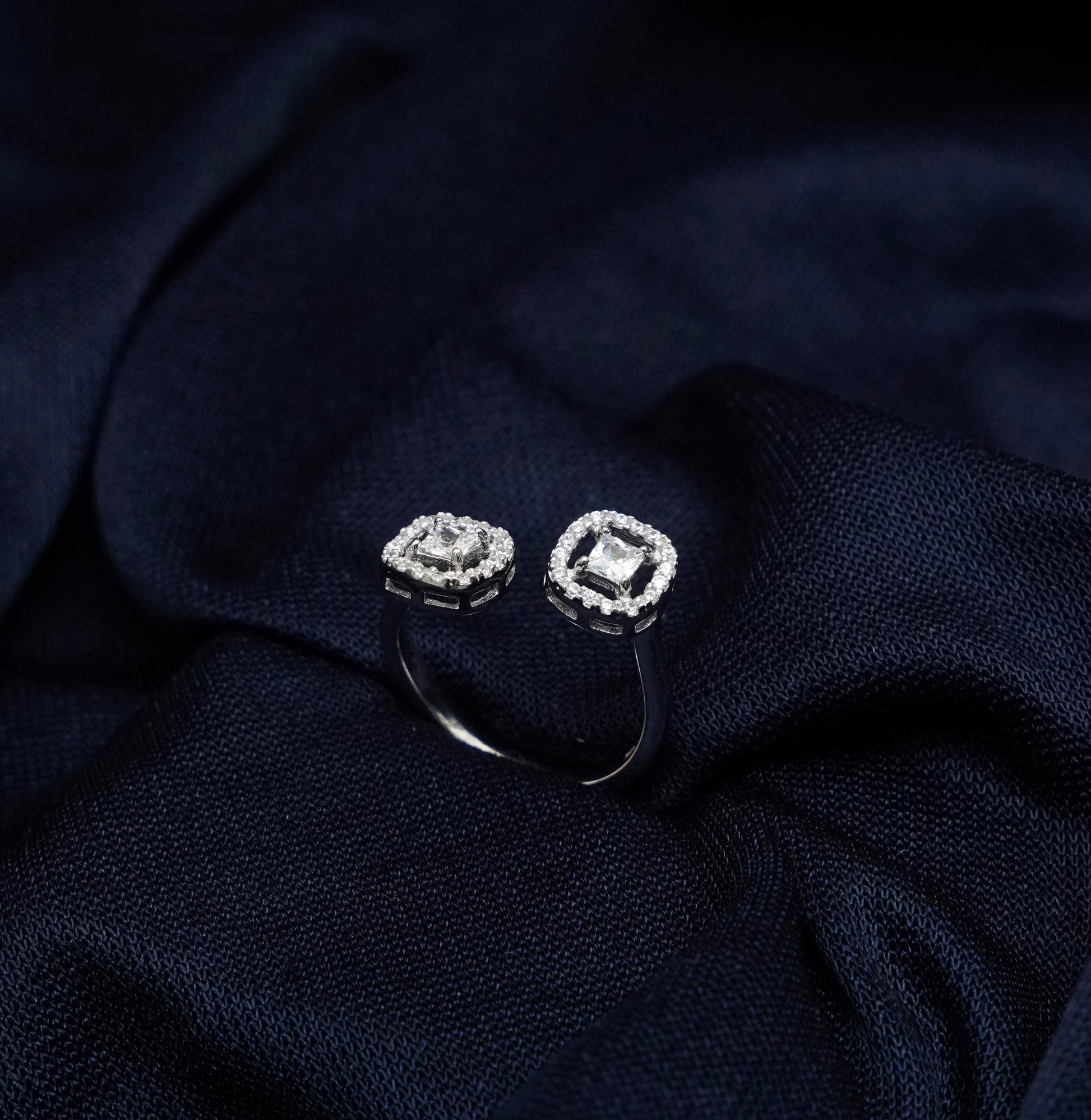 Thoughtfully designed by Kesari Rajat in hallmarked 92.5 silver, this polished dual-stone ring reflects a perfect harmony of elegance and charm. Its unique twin-square design with sparkling accents makes it an ideal choice for festive celebrations, parties, casual wear, or heartfelt gifting.