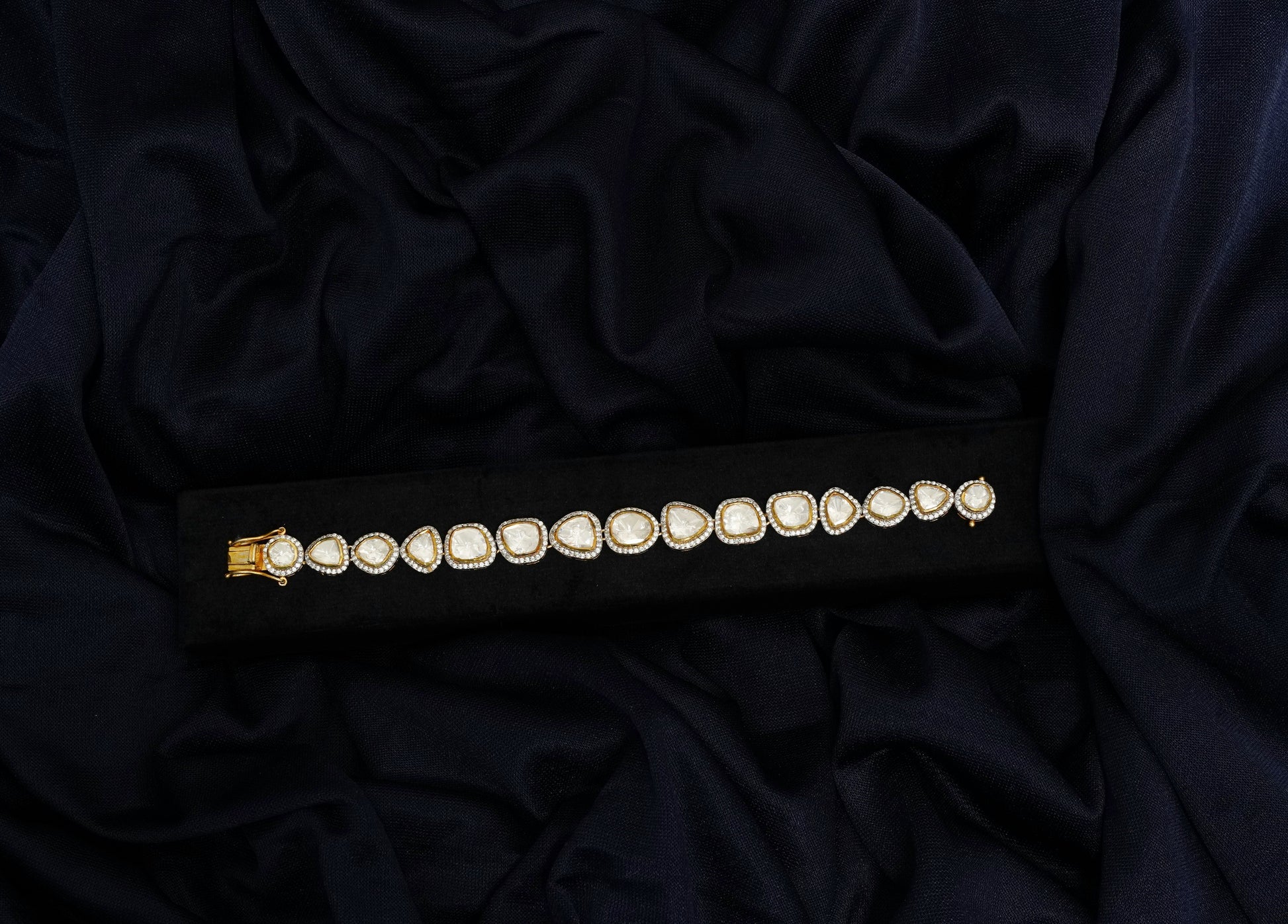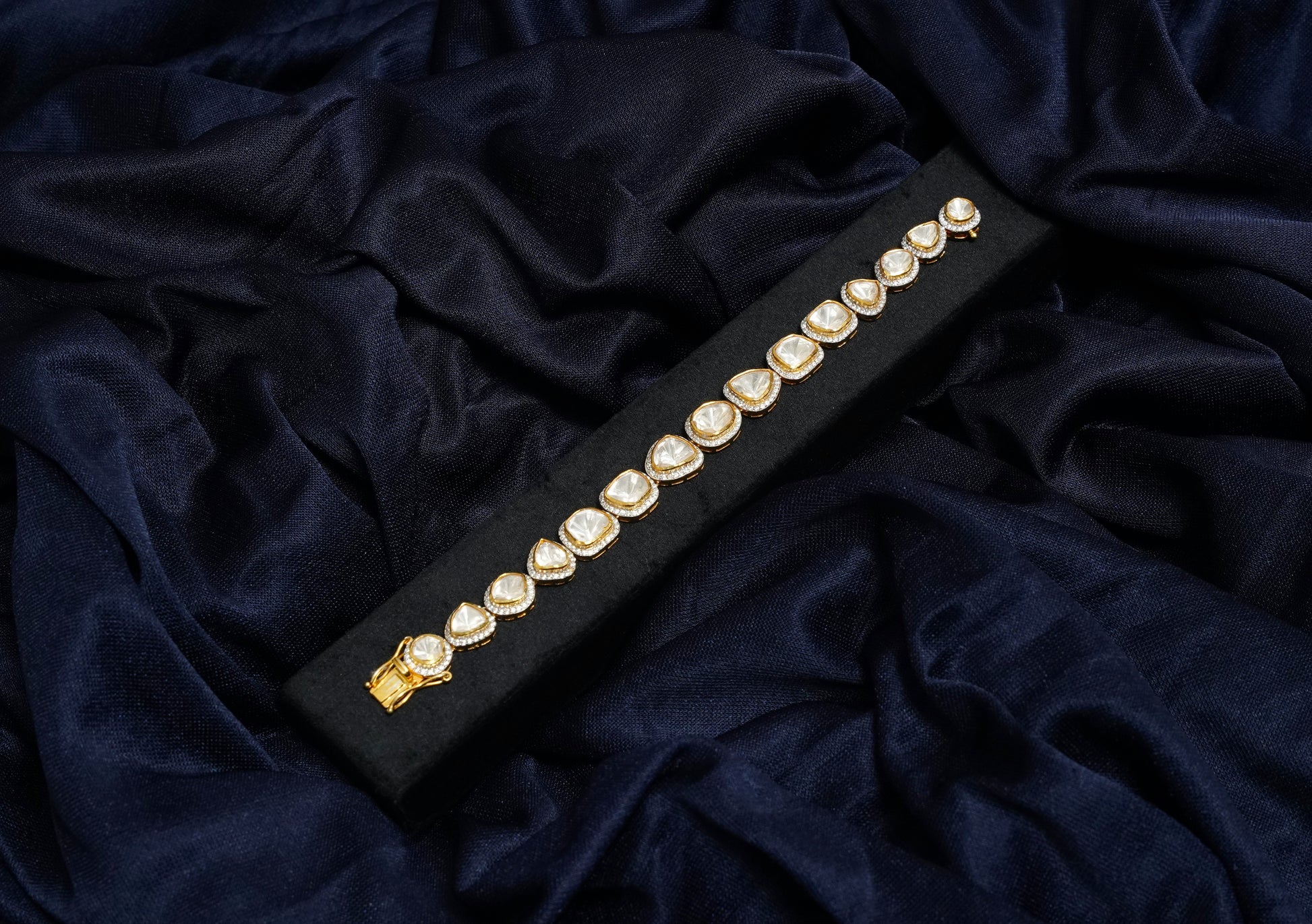 Thoughtfully designed by Kesari Rajat in hallmarked 92.5 silver with a polished finish, this bracelet showcases a seamless row of luminous kundan motifs, exuding charm and grace. Ideal for festive occasions, parties, or gifting, it adds a regal touch to every ensemble.