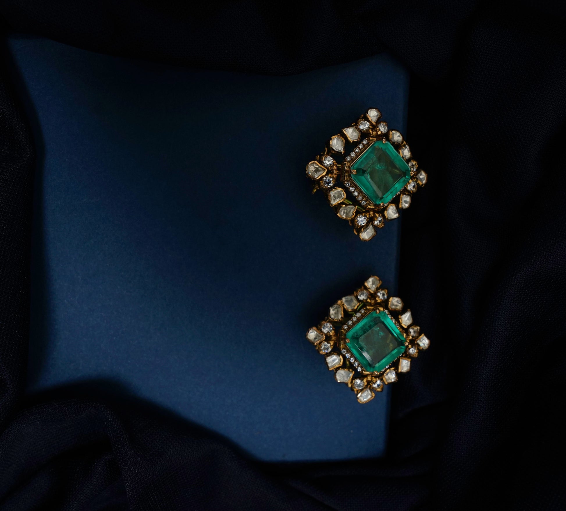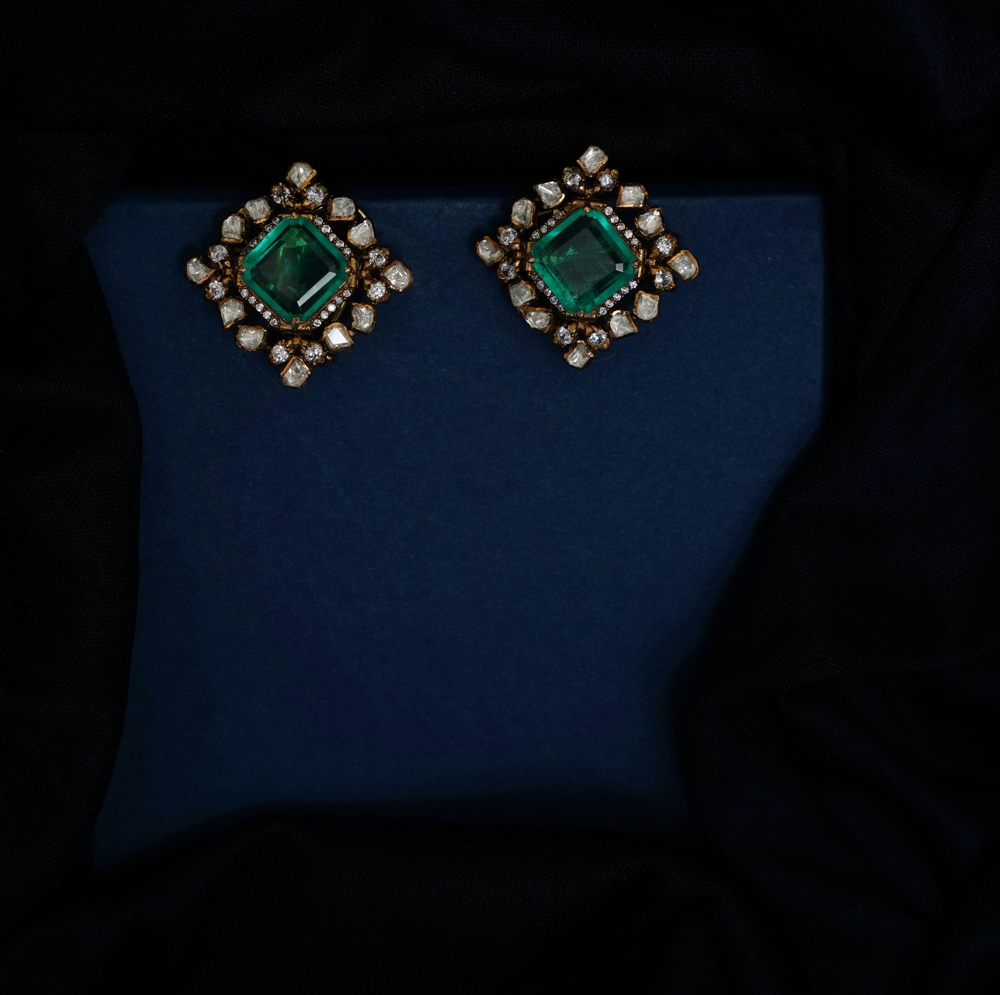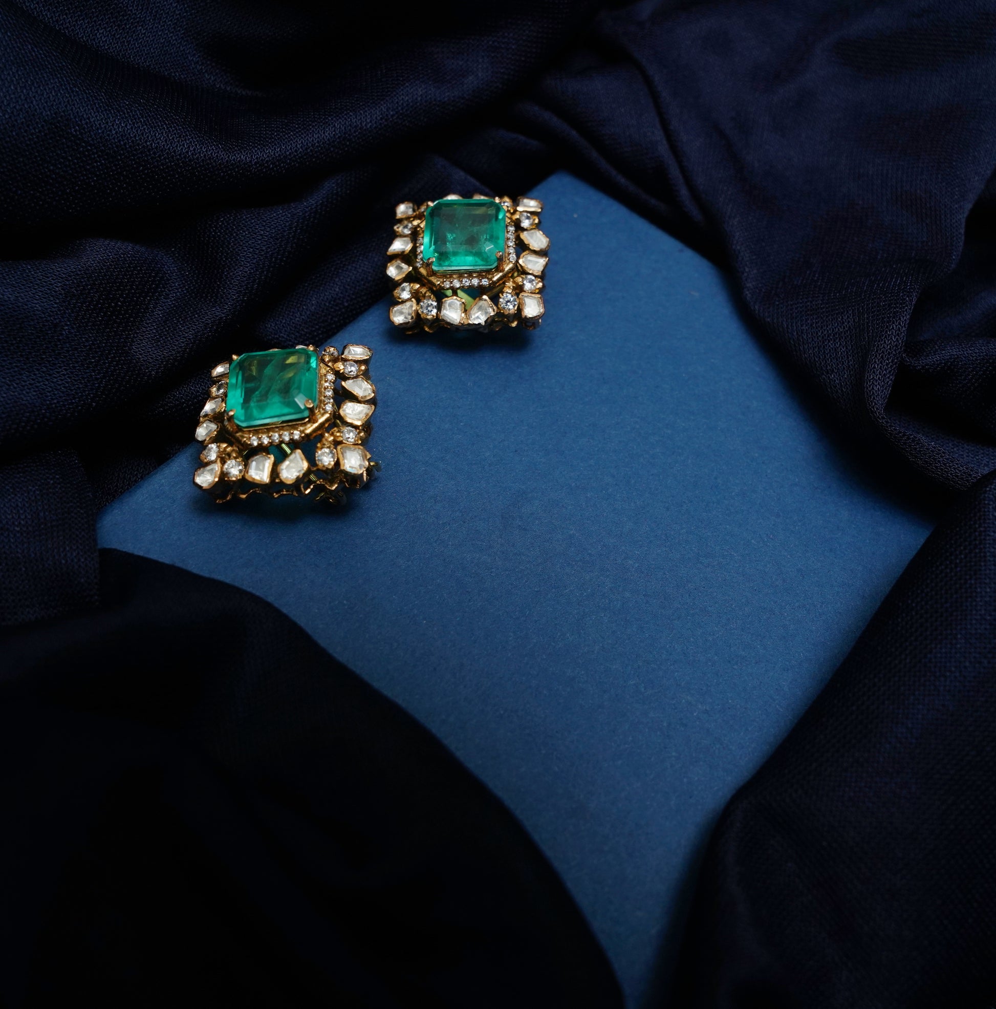 Thoughtfully designed by Kesari Rajat in hallmarked 92.5 silver, these polished earrings showcase a majestic square green stone surrounded by a glittering halo. Crafted entirely in pure 925 silver, they embody grandeur and timeless elegance. Perfect for festive occasions, bridal looks, parties, and gifting.