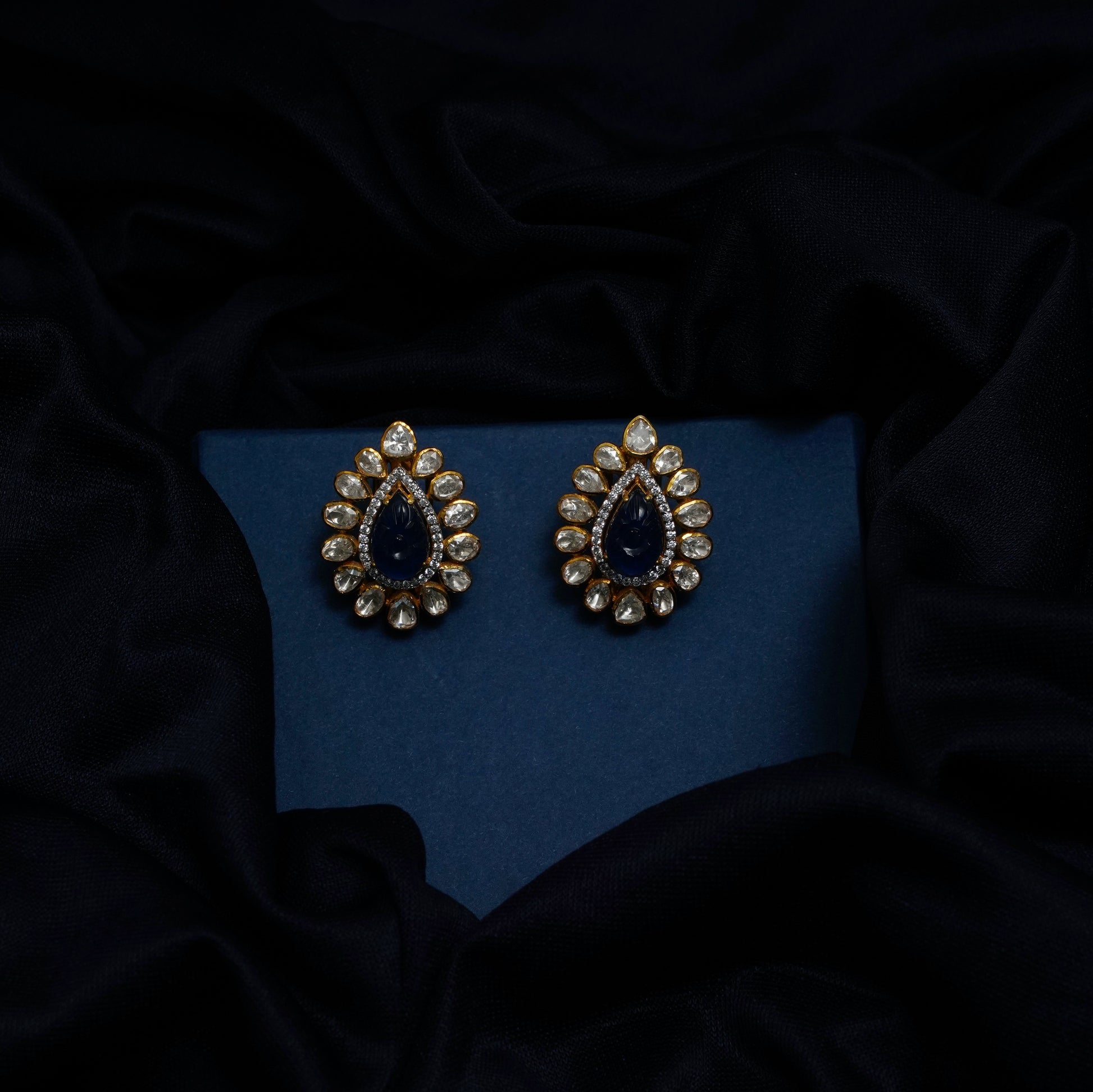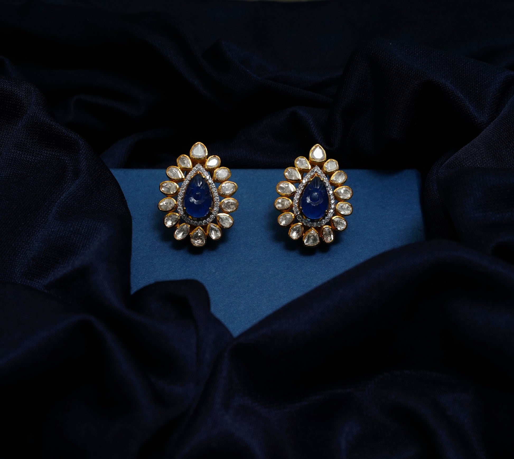 Thoughtfully designed by Kesari Rajat in hallmarked 92.5 silver, this stunning pair is handcrafted in pure 925 silver with a polished finish. Featuring a deep blue centerpiece surrounded by radiant stones, these earrings exude royal charm. Perfect for festive occasions, bridal ensembles, parties, or gifting, they embody timeless elegance and sophistication.