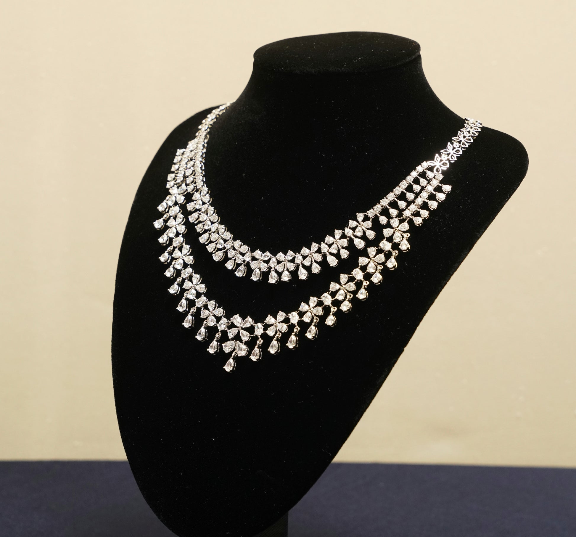 Crafted by Kesari Rajat in hallmarked 92.5 silver, this polished layered necklace features a graceful floral-inspired drape design. With its delicate arrangement and flowing symmetry, it brings timeless elegance to festive gatherings, bridal ensembles, and thoughtful gifting. Its versatile charm ensures it complements both traditional and contemporary attire with equal radiance.