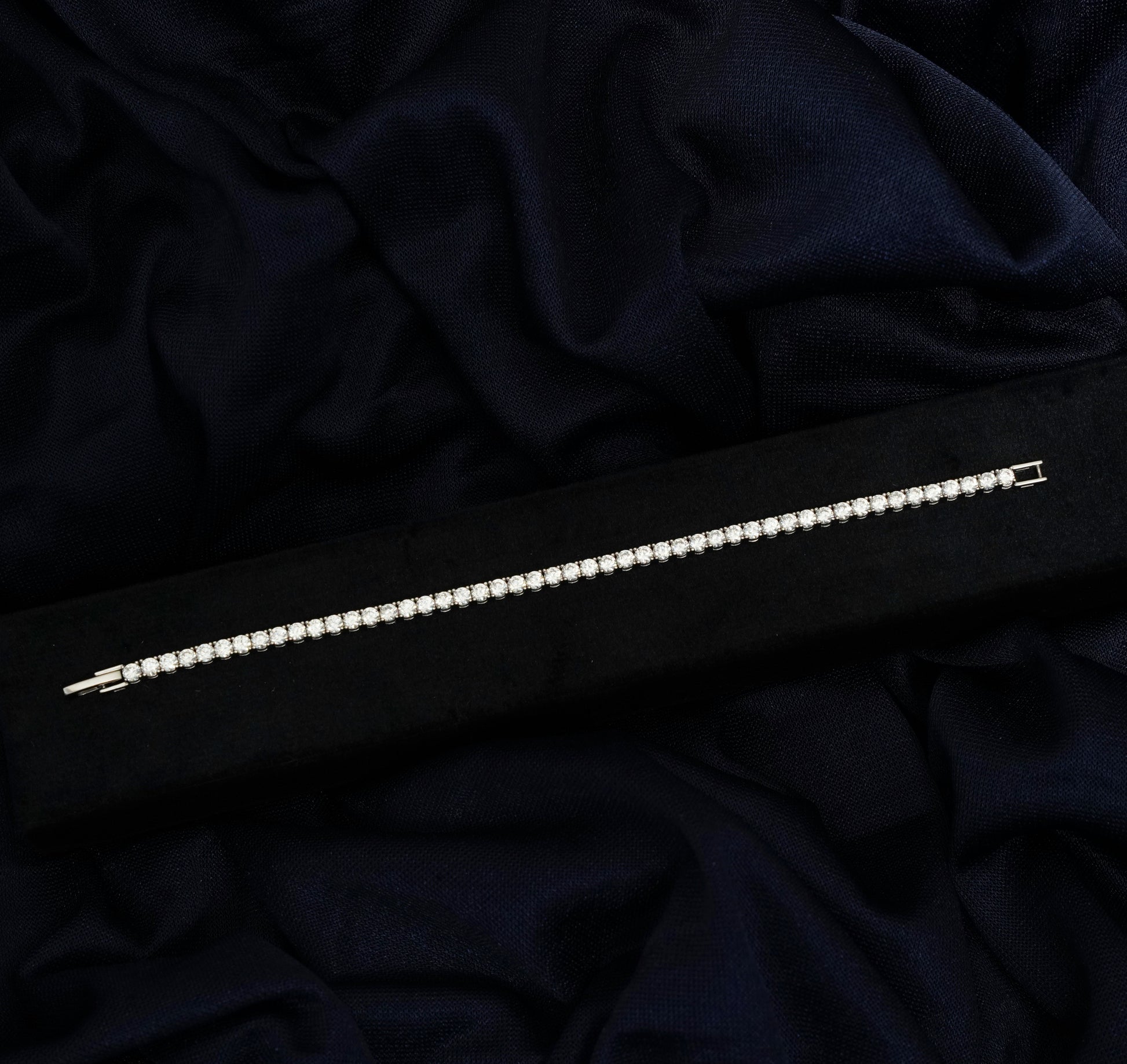 Thoughtfully designed by Kesari Rajat in hallmarked 92.5 silver with a polished finish, this elegant tennis bracelet showcases intricately set halo motifs that enhance the brilliance of each stone. A versatile piece for festive charm, party wear, casual wear elegance, or thoughtful gifting, it embodies understated luxury.