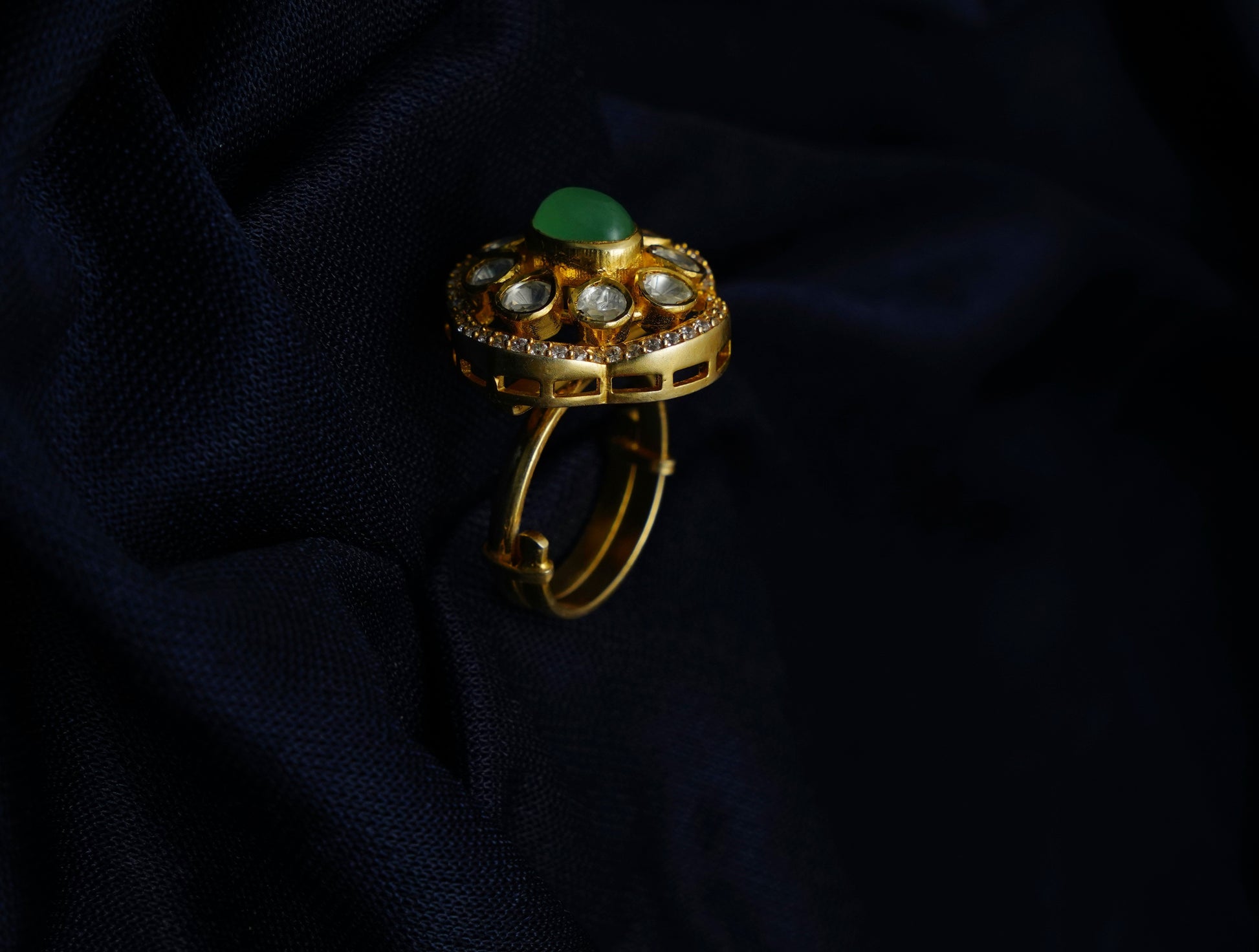Thoughtfully designed by Kesari Rajat in hallmarked 92.5 pure silver, this polished ring features a serene green gemstone embraced by kundan petals and a halo of sparkling accents. A regal statement piece, perfect for festive, bridal, party, and gifting occasions, crafted in pure 925 silver for timeless allure.