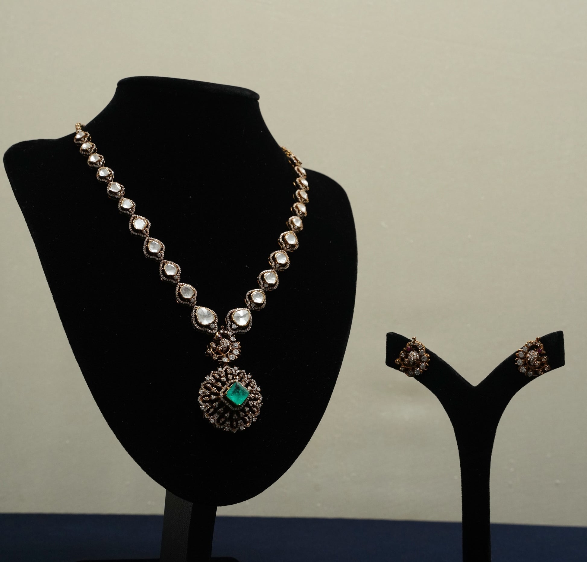 Thoughtfully designed by Kesari Rajat in hallmarked 92.5 silver with a polished finish, this refined necklace and earring set showcases shimmering kundan stones leading to a striking emerald centerpiece. Perfect for weddings, festive gatherings, or treasured gifting, it embodies timeless elegance with a royal touch.