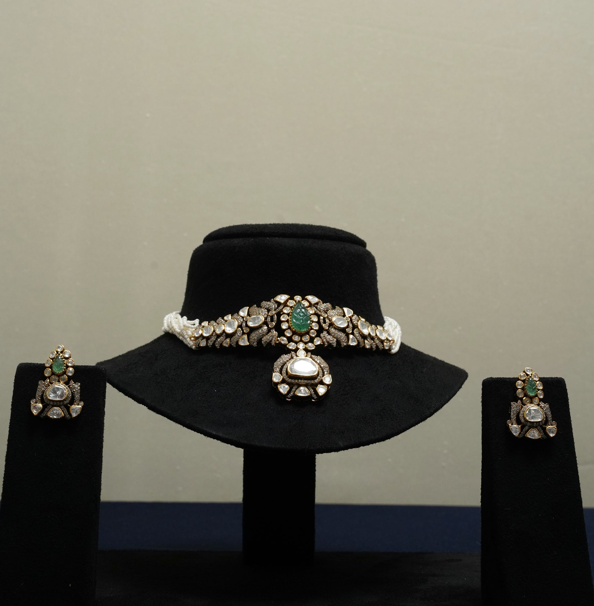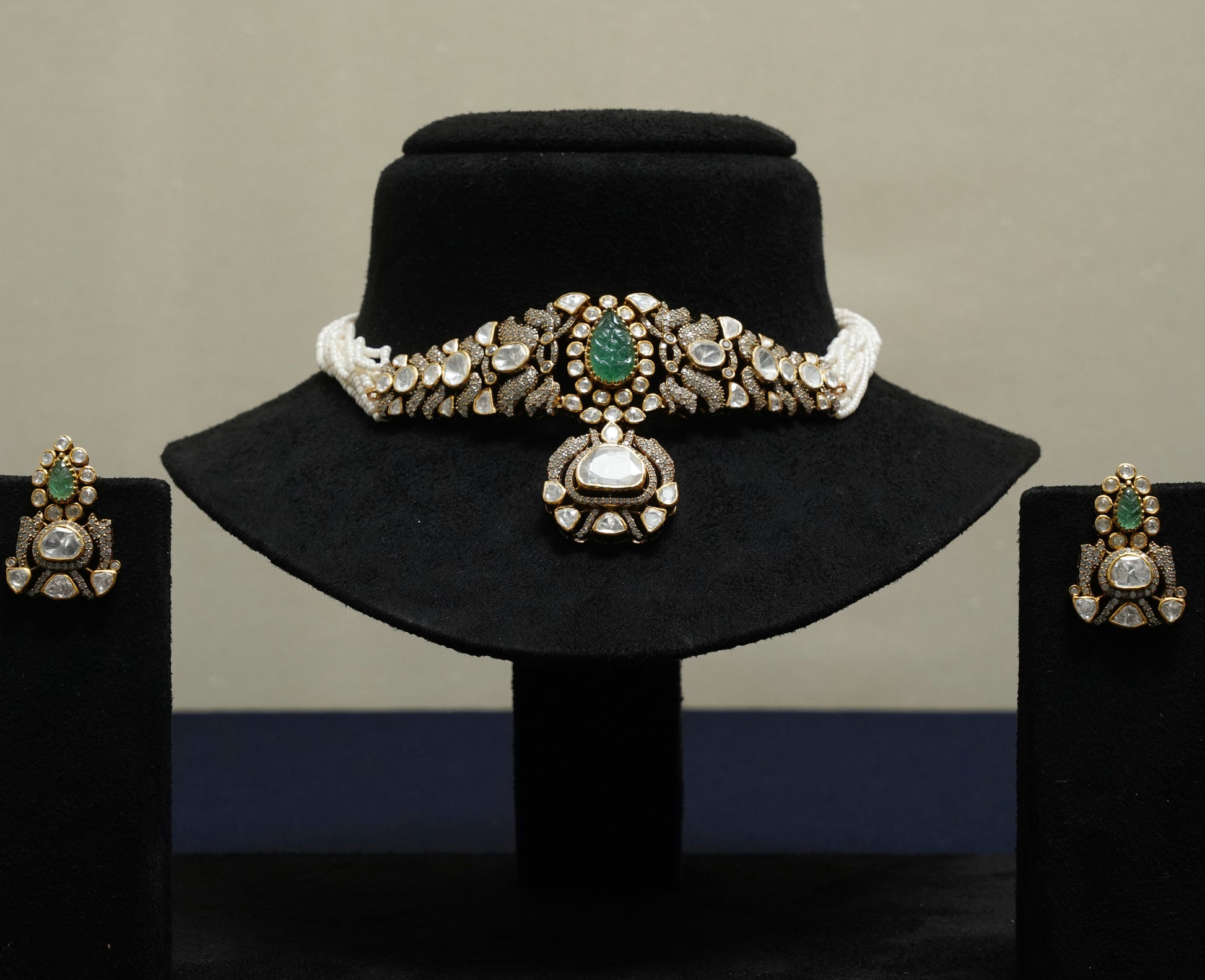 Thoughtfully designed by Kesari Rajat in hallmarked 92.5 silver with a polished finish, this statement choker and earring set features elaborate polki-style detailing enriched with emerald green stones and pearl embellishments. Ideal for bridal wear, festive gatherings, and heirloom-worthy gifting, it reflects heritage beauty with modern elegance.