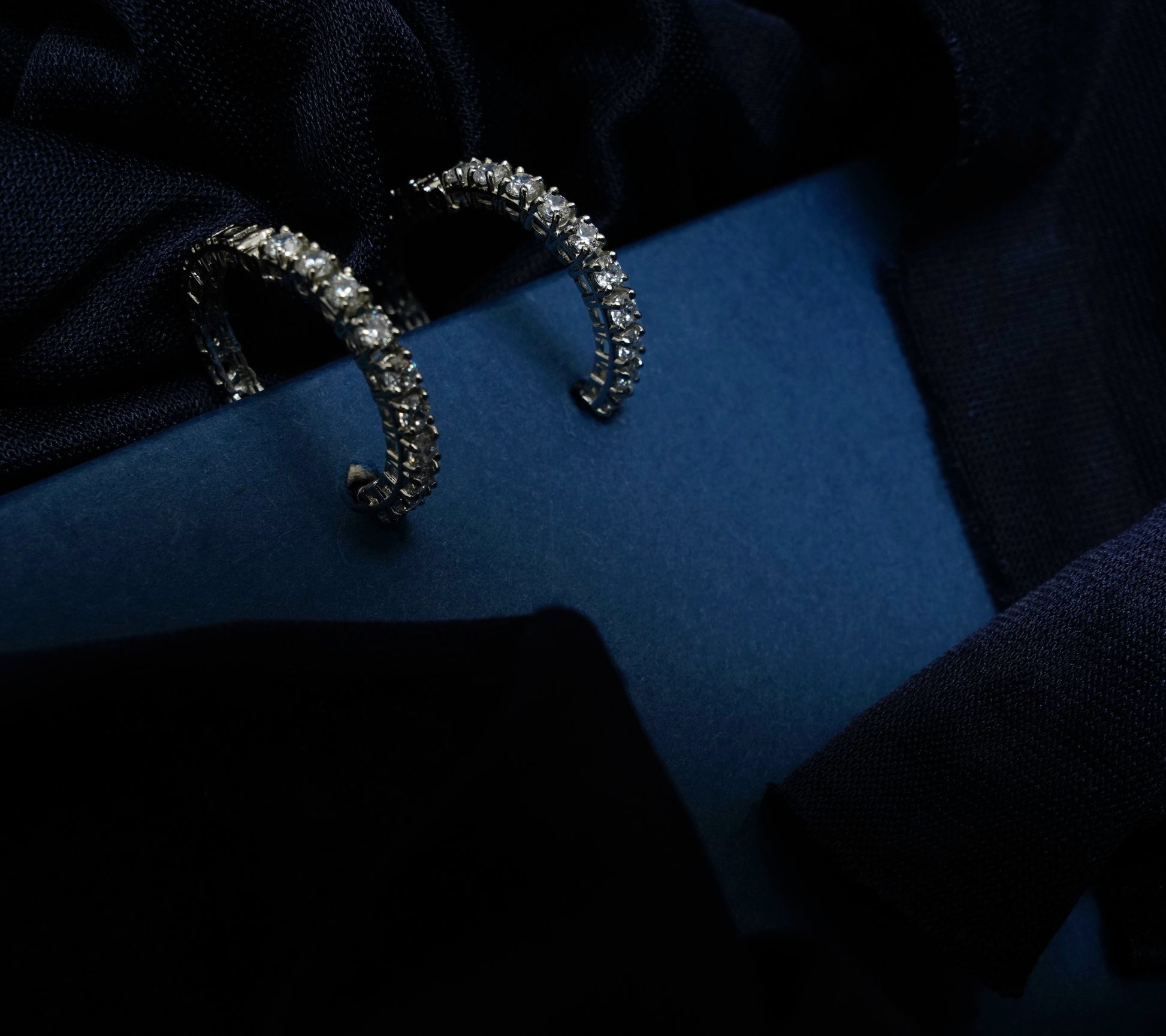 Crafted by Kesari Rajat in hallmarked 92.5 silver with a polished finish, these graceful hoop earrings dazzle with a row of CZ brilliance, striking the perfect balance between minimalism and glamour. Designed for festive glow, bridal sophistication, and elegant gifting.