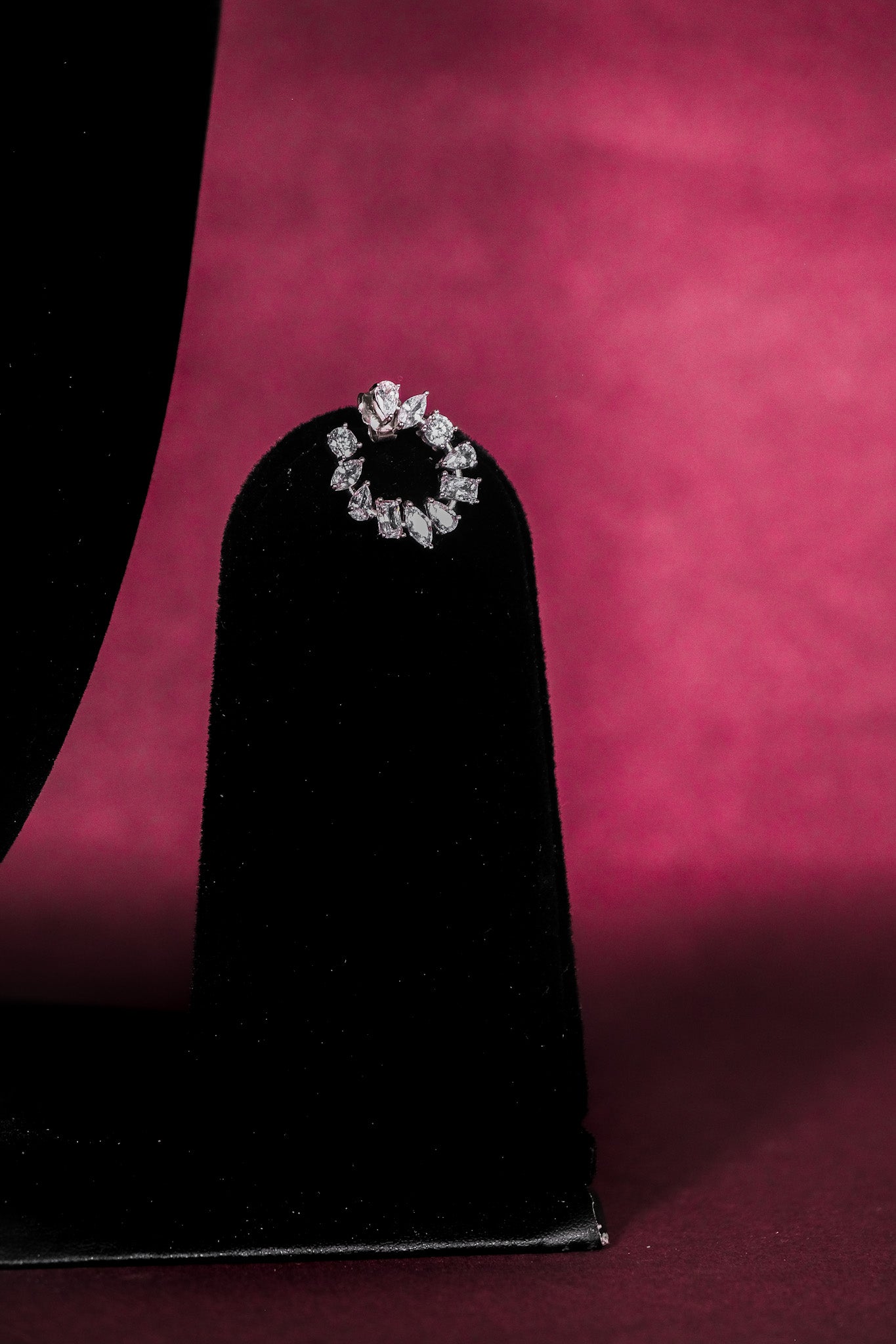 Crafted by Kesari Rajat in hallmarked 92.5 silver with a polished finish, this elegant hoop-style earring glimmers with a mix of baguette and round stones arranged in a wreath-like pattern. Its modern yet festive silhouette makes it a charming choice for everyday sparkle or thoughtful gifting.
