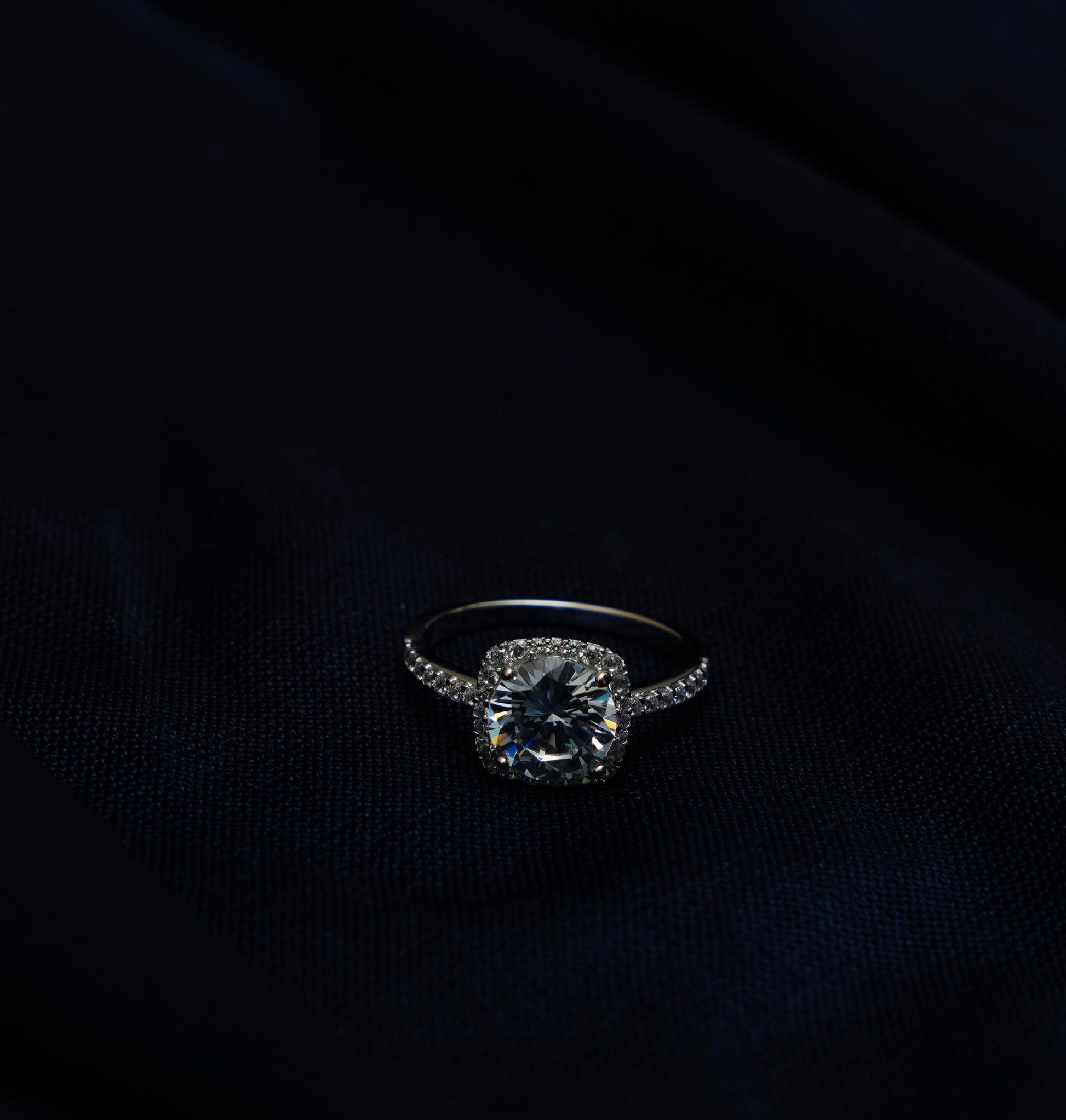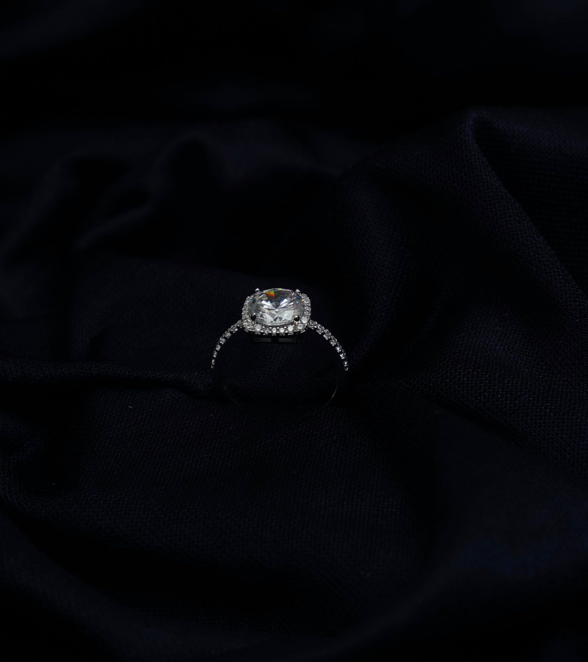 Thoughtfully designed by Kesari Rajat in hallmarked 92.5 silver, this polished pure 925 silver ring features a radiant solitaire at its center, embraced by a cushion-shaped halo of shimmering stones. The sleek band, studded with sparkling accents, adds a refined brilliance that makes the piece stand out with understated luxury.