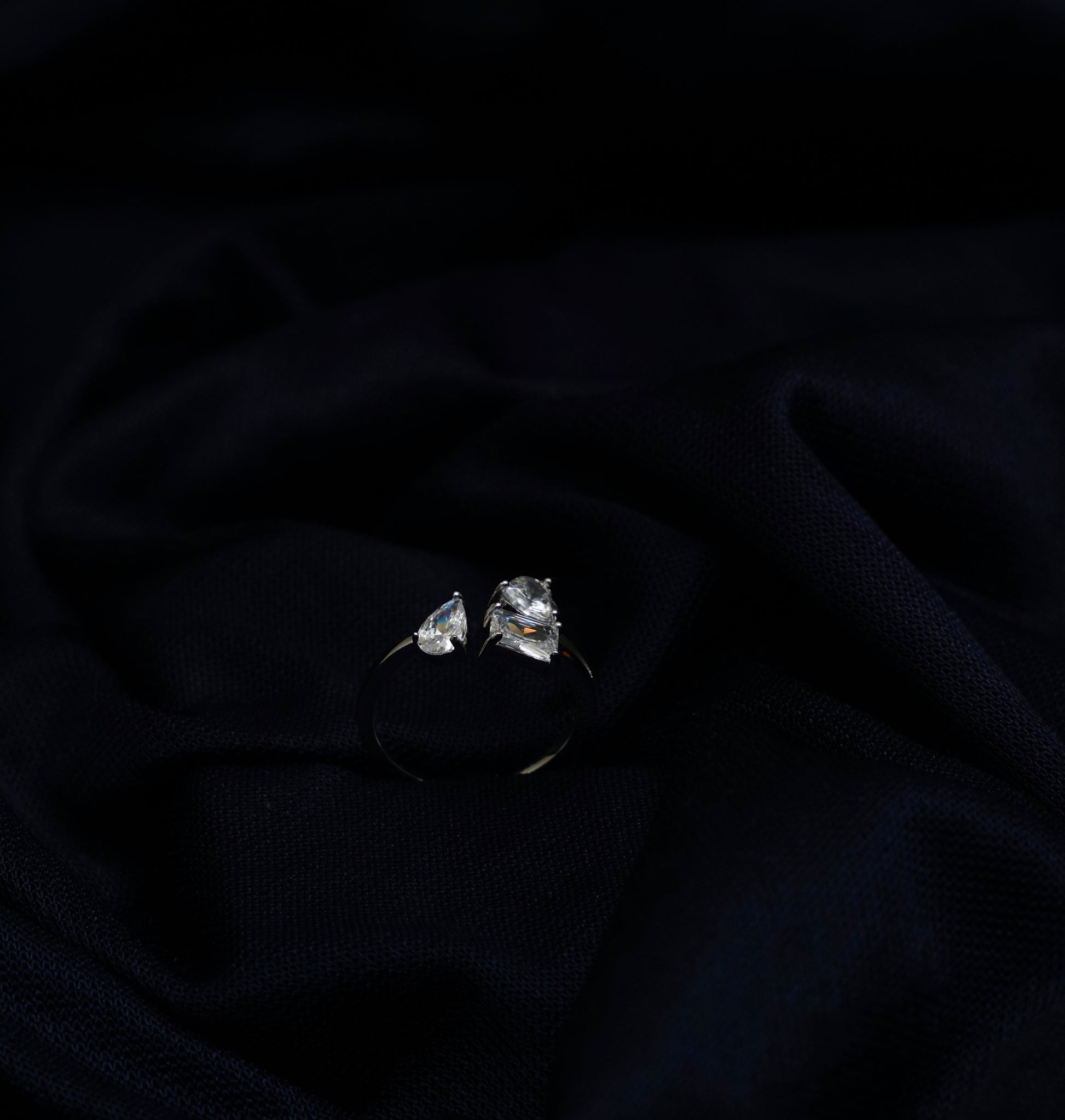 Thoughtfully designed by Kesari Rajat in hallmarked 92.5 silver, this pure 925 silver ring is finished with a polished shine and adorned with three distinct stone cuts—pear, square, and round—creating a modern yet timeless balance. Its adjustable design ensures a perfect fit, making it an ideal choice for festive occasions, parties, casual wear, or gifting.