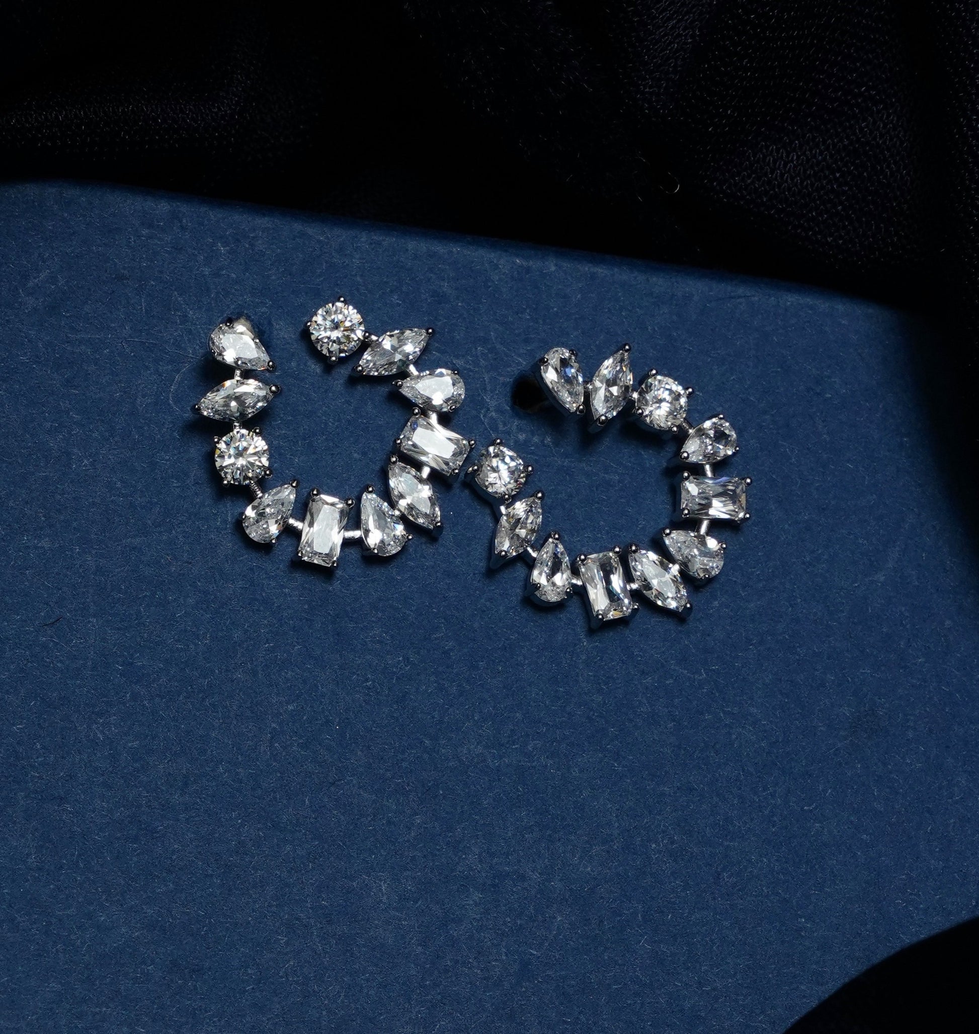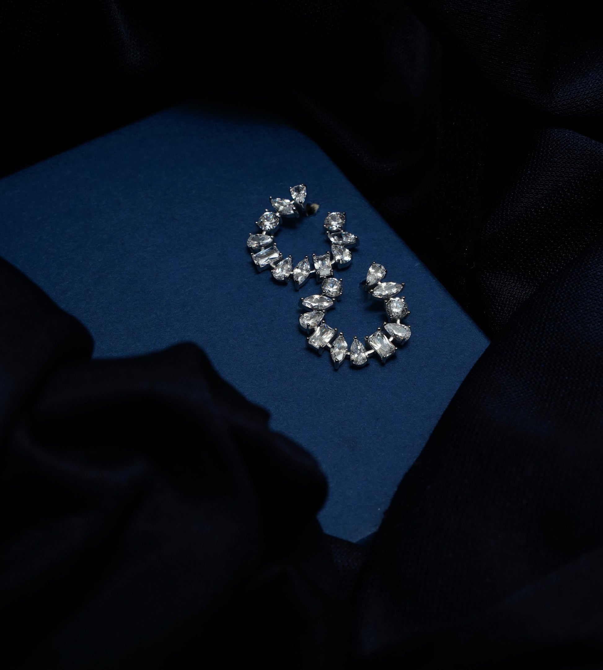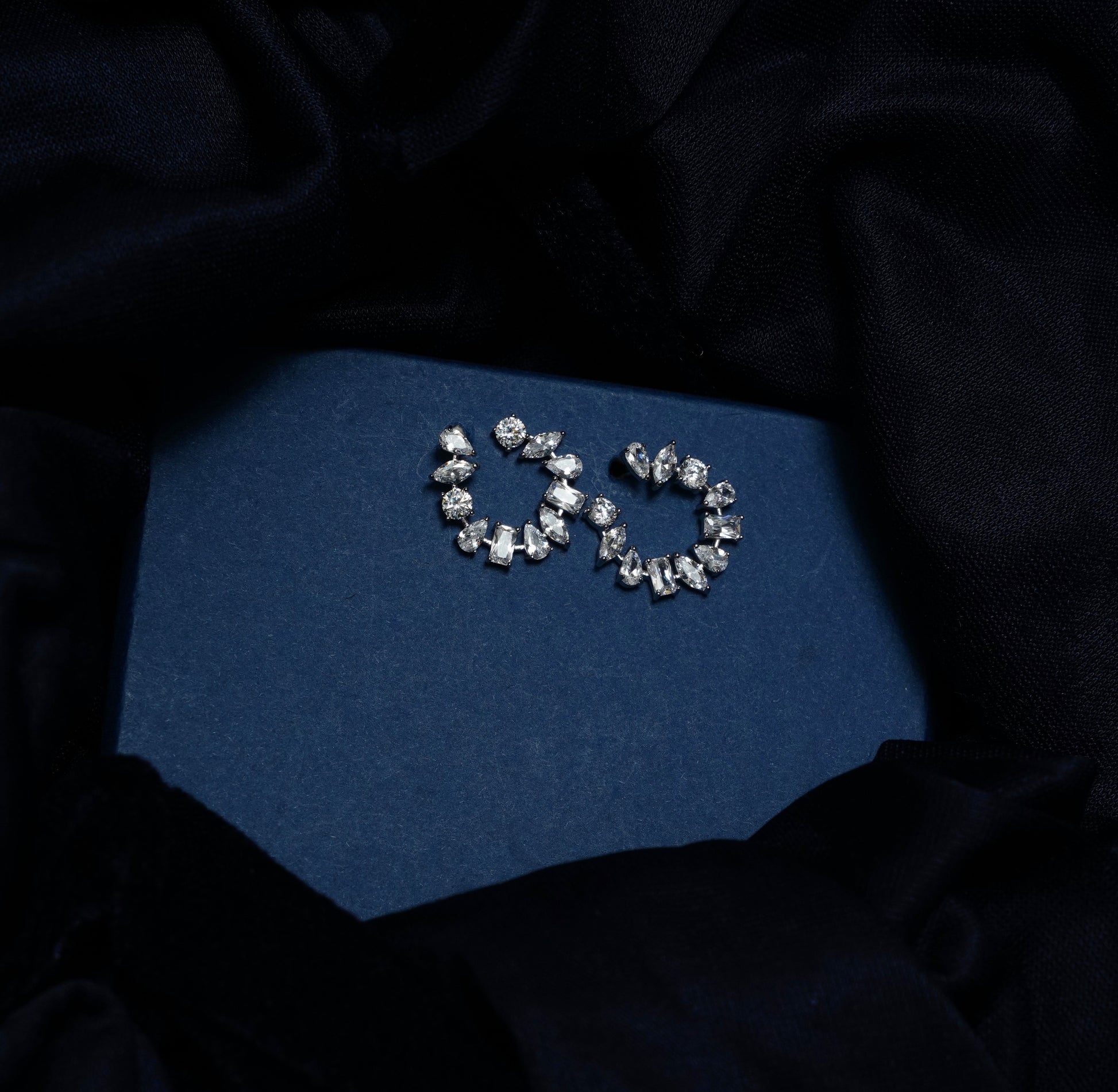 Thoughtfully designed by Kesari Rajat in hallmarked 92.5 silver, these pure 925 silver earrings feature a contemporary open-hoop silhouette adorned with brilliant cuts. With a polished finish, they radiate modern elegance, making them ideal for festive celebrations, bridal ensembles, chic parties, or gifting. A versatile treasure that blends timeless artistry with a bold edge.