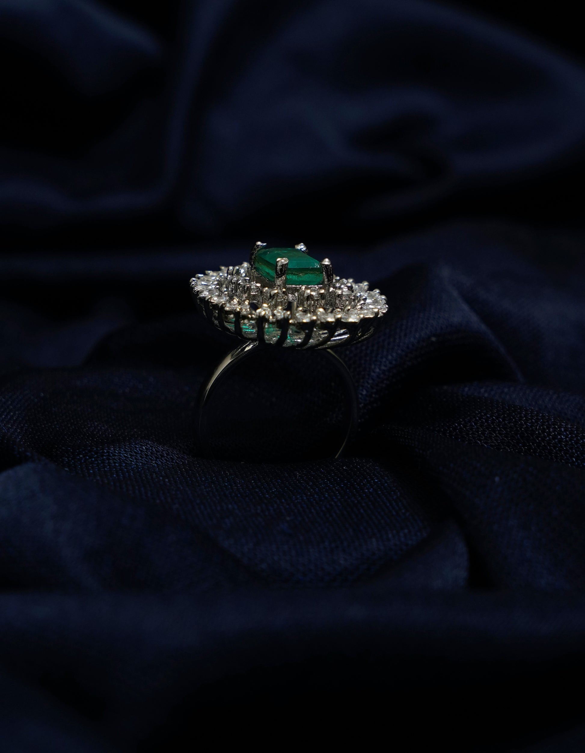 Thoughtfully designed by Kesari Rajat in hallmarked 92.5 silver, this polished ring showcases a vivid green emerald centerpiece embraced by a sparkling halo of stones. Crafted in pure 925 silver, it radiates luxury and grace, perfect for festive occasions, bridal wear, parties, or as an unforgettable gift.